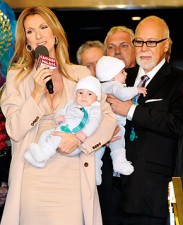 With such ridiculous looking boobs, Celine has a great built in hands-free portable mic stand so she can hold her baby. Tee hee.