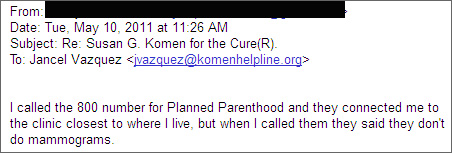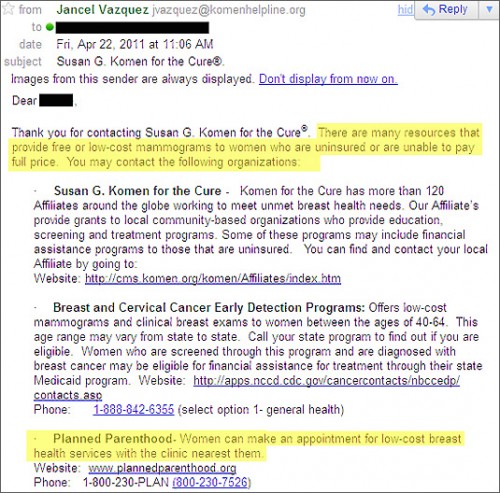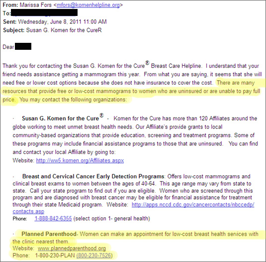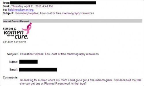 Inexcusably, the Susan G. Komen for the Cure breast cancer foundation is telling people they can get mammograms at Planned Parenthood, which most certainly is not true.