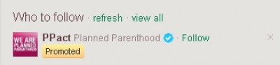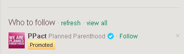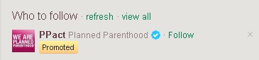 PPAC is paying Twitter to promote its name in its “Who to follow” section. The cost? According to ClickZ.com, somewhere between $10-$70 per follower. Last week PP had about 17,500 followers. Tonight it has 18,172 followers. Say 500 of those followers came from the Twitter ad, then Planned Parenthood spent between $5,000-35,000 to get them.