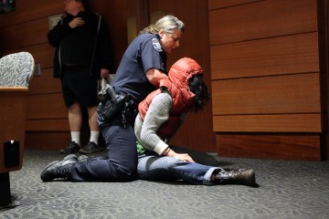 According to KOMONews.com, there were dozens of protesters inside and outside the lecture hall, and there were arrests…