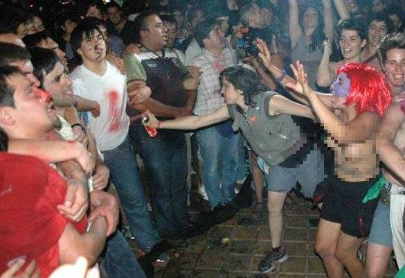 The women, many of them topless, spray-painted the men’s crotches and faces and swastikas on their chests and foreheads, using markers to paint their faces with Hitler-like moustaches. They also performed obscene sexual acts in front of them and pushed their breasts onto their faces, all the while shouting “get your rosaries out of our ovaries.”…