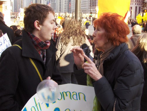 I wrote in my previous post that pro-life stalwarts attending Joe’s fete would surely try to engage pro-aborts. Yep, here’s a photo of one of our best, Cathy, pictured right, trying to discuss abortion with an opponent…